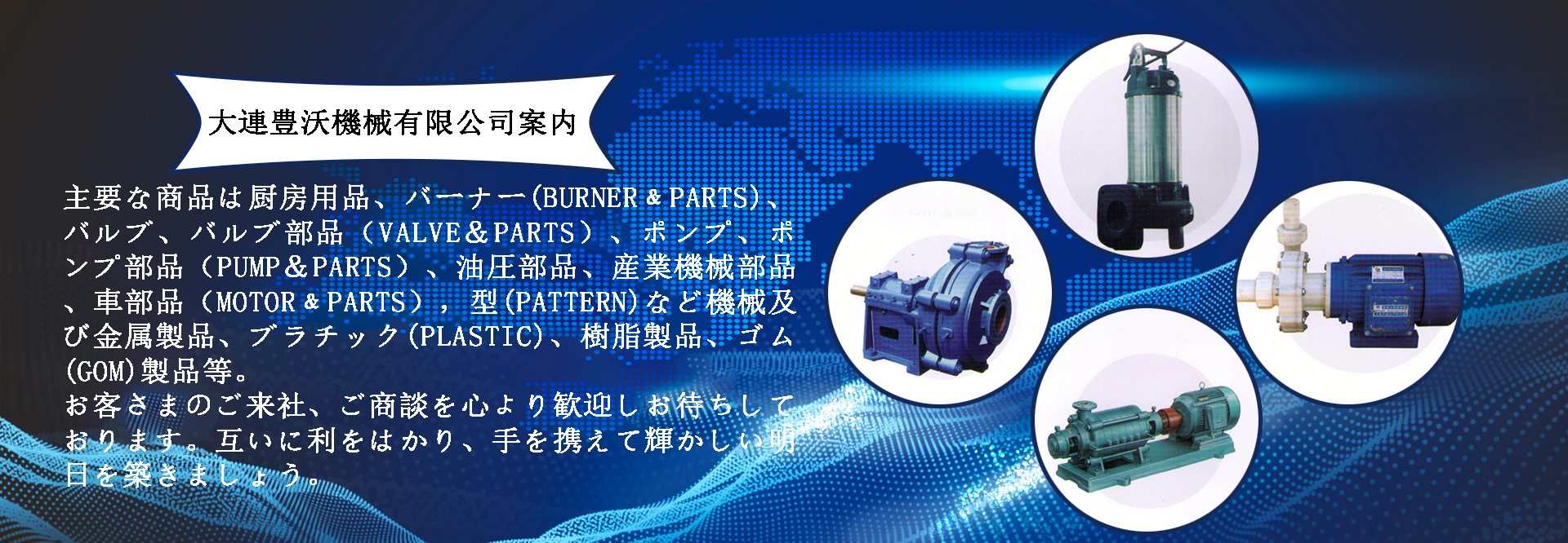 大連豊沃機械有限公司は國際貿易を主にして 専門商社でおり、子會社の機械加工工場を1社持ち、業(yè)務提攜パトーナが數(shù)社あります。國際貿易を従事して十年以上、メインは日本向けですが、アメリカ、ューロパ市場向けも少しあります。砂鋳造(CASTING)(FC,FCD,FACD,ADI)、ロストワックス(LOST-WAX)、鋳鋼(SC,SCS)、ステンレス(SUS)、ダイカスト(DIE-CASTING)(アルミ、真鍮)、鍛造(FORGING)、プレス(PRESS)、製缶(WELDING)など幅多く分野ております。主要な商品は廚房用品、バーナー(BURNER﹠PARTS)、バルブ、バルブ部品(VALVE&PARTS)、ポンプ、ポンプ部品(PUMP&PARTS)、油圧部品、産業(yè)機械部品、車部品(MOTOR﹠PARTS),型(PATTERN)など機械及び金屬製品、ブラチック(PLASTIC)、樹脂製品、ゴム(GOM)製品等。